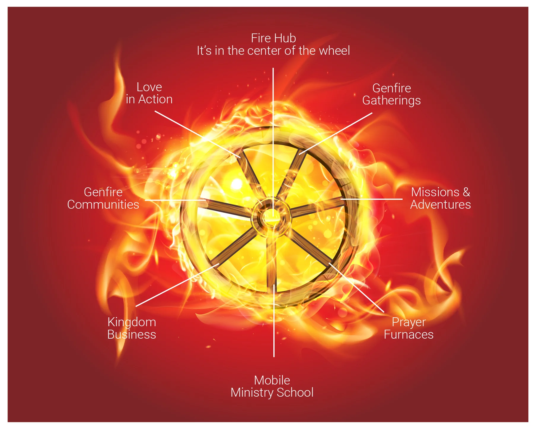 Fire Hubs are Apostolic Centres called to Host the Presence of God. As you can see in the diagram - The best way to visualise what is a Fire hub is through looking at a Wheel in this case the Wheel is based on the Ezekiel's Vision of a Burning Wheel.