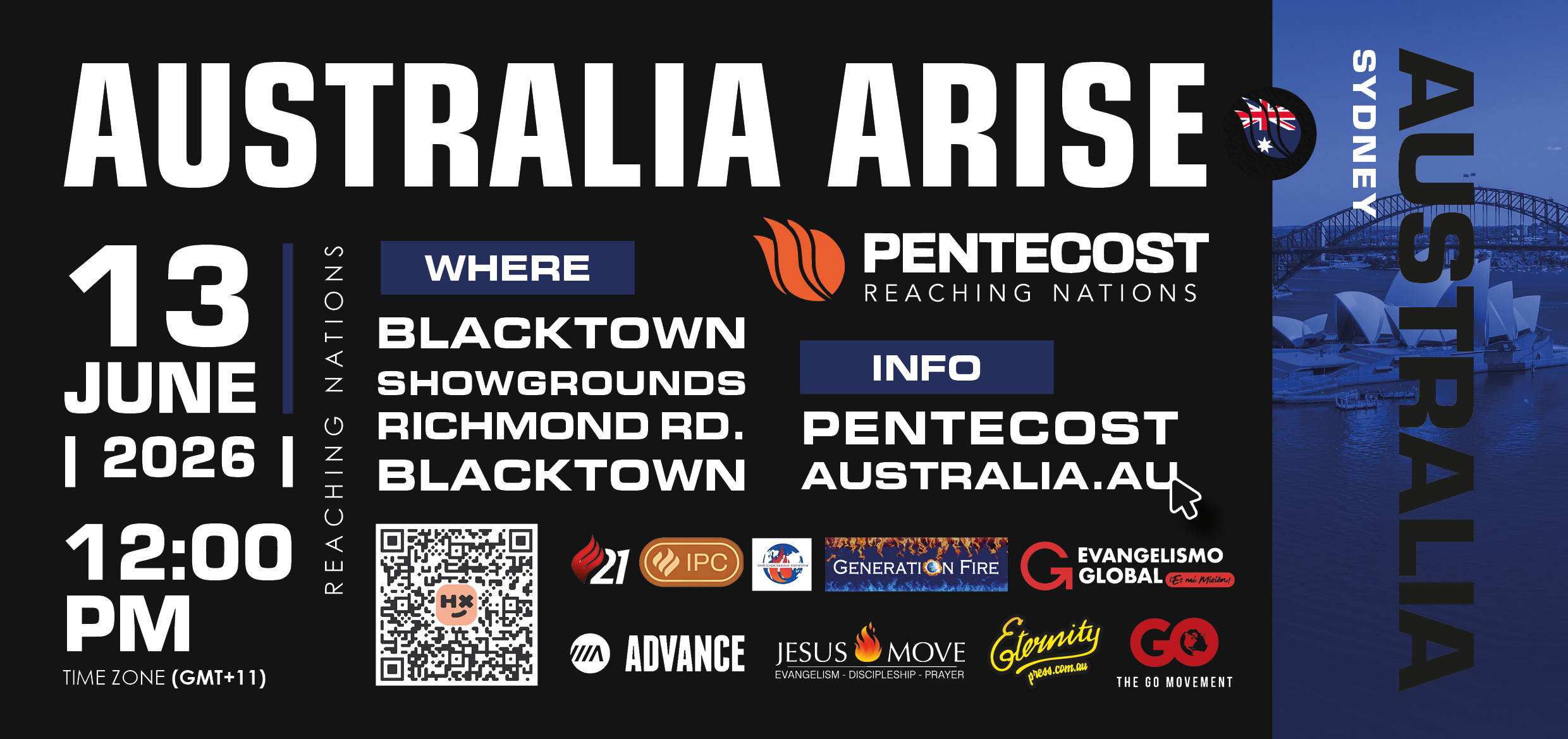 Pentecost 26 Australia Arise (Sydney, Australia) | 13 June A national day of worship, intercession, and Gospel proclamation at the Blacktown Showgrounds from 12:00 PM to 9:00 PM.